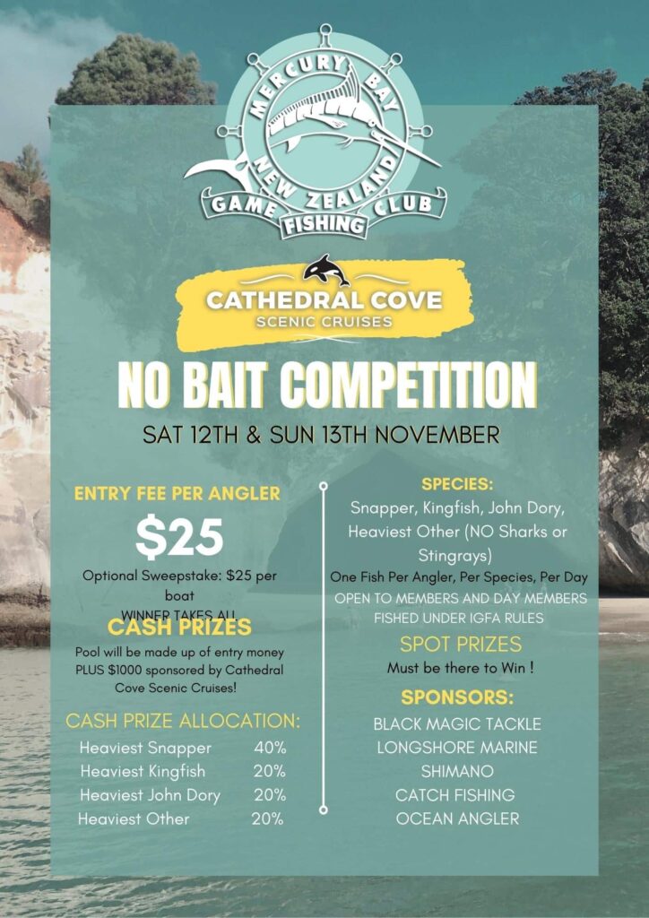 Following on from our very successful snapper tournament on Labour Weekend, we are due to hold the Cathedral Cove Scenic Cruises No Bait Tournament on November 12th and 13th.