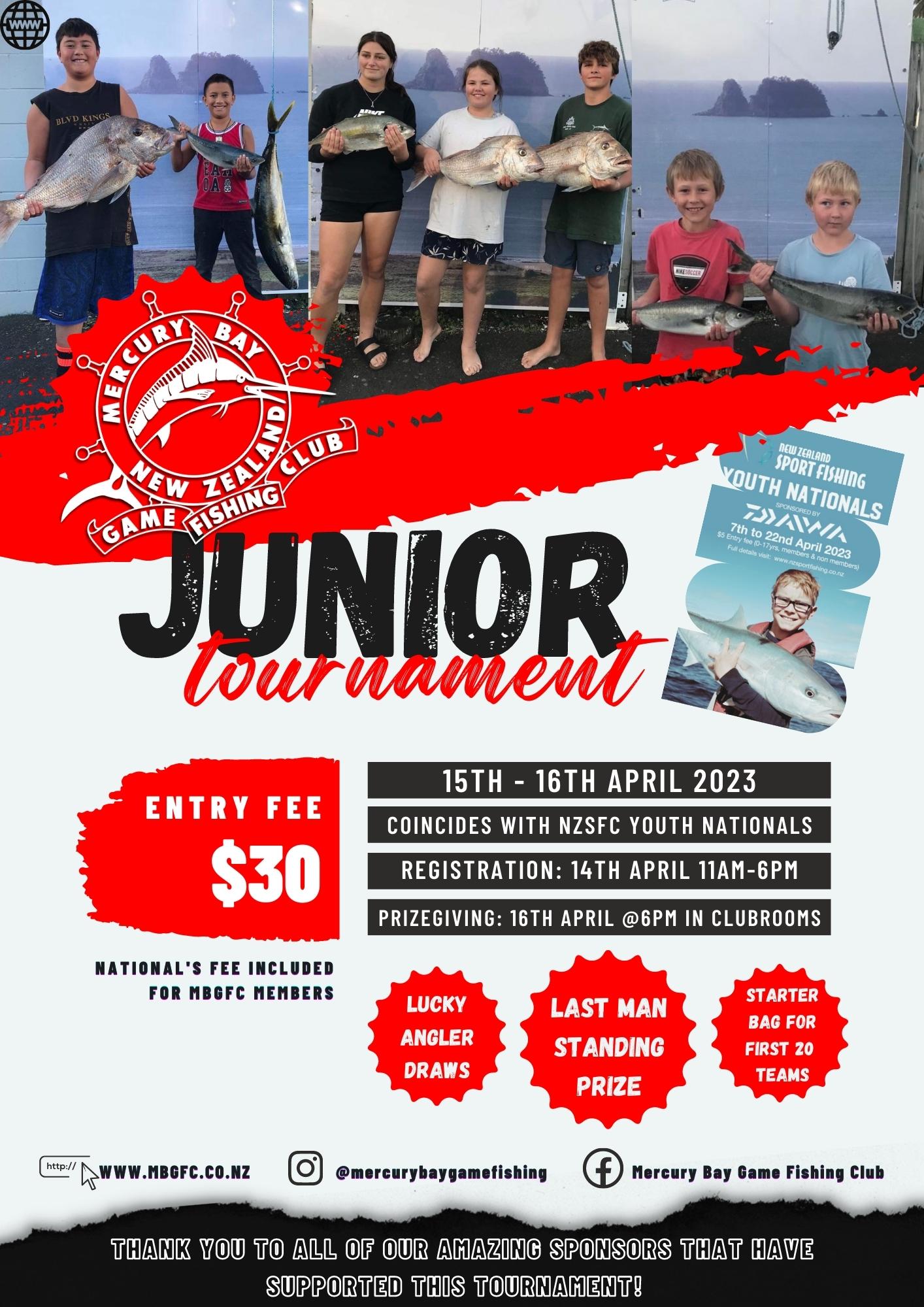 If you have not already entered the junior competition and would like to fish the Youth Nationals for Mercury Bay Game Fishing Club, please let the office know asap so we can get you registered.