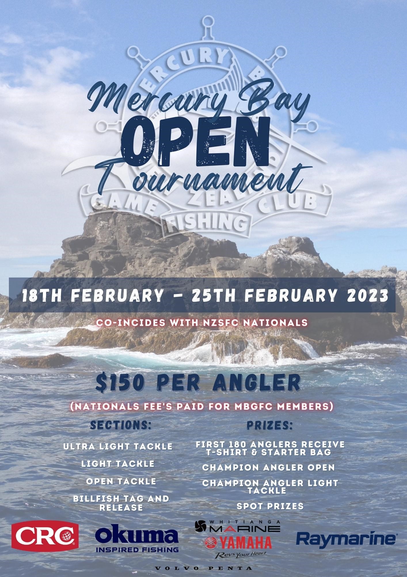 We welcome four main sponsors to the 2023 Mercury Bay Open Tournament – CRC, Raymarine, Okuma and Whitianga Marine/Yamaha with Volvo Penta sponsoring the Ultra Light/Light Tackle Section